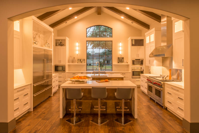 This beautiful kitchen features a predominantly neutral color scheme. The designer chose the palette, and it simply must come across in the photograph. The cabinets are white. Not off-white. Not tan. Not orange. But correcting the color of the interior results in a ghastly blue color from the windows which would have stuck out like a sore thumb (see above) if it had not ALSO been corrected.